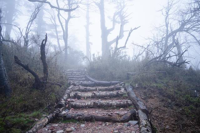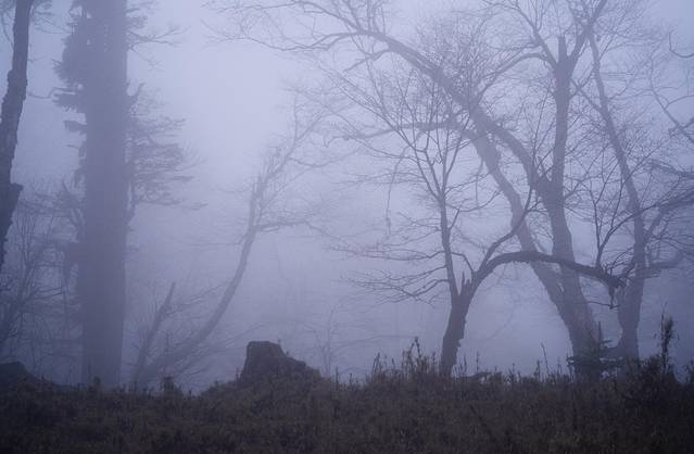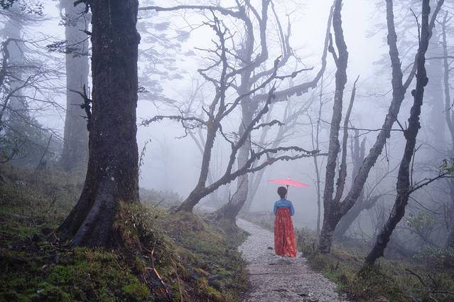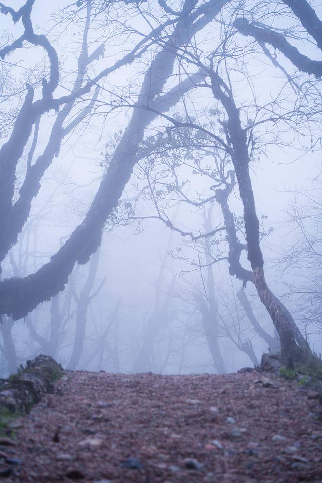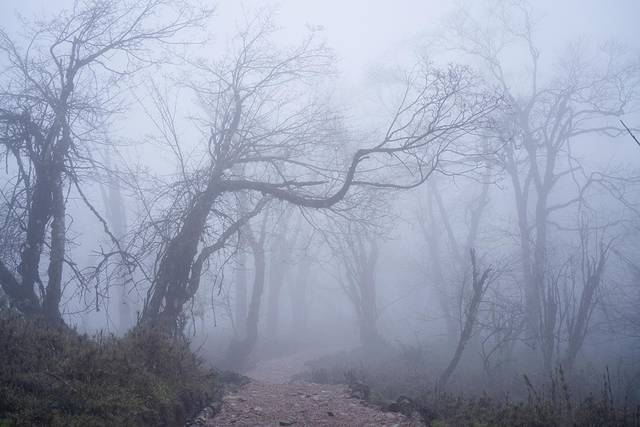 树林里的树干姿态万千,有的像壮士,有的像恶魔,在晨雾的笼罩下更增添了几分神秘色彩。