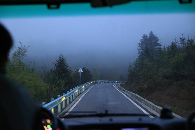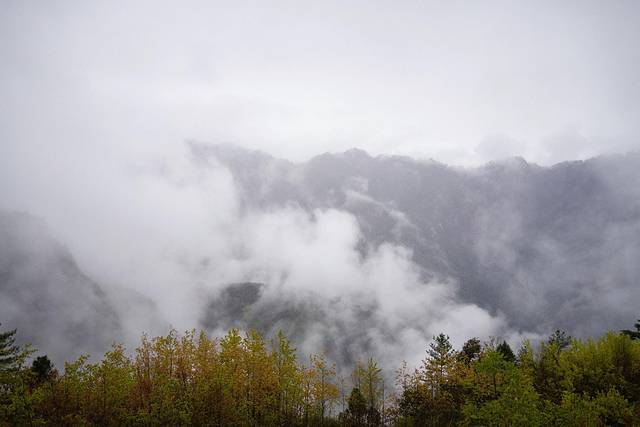 观光车行驶在山间,因为天气原因雪山被云雾深深包围着,不肯露出神秘面容,于是我们准备先去怪树林看看。