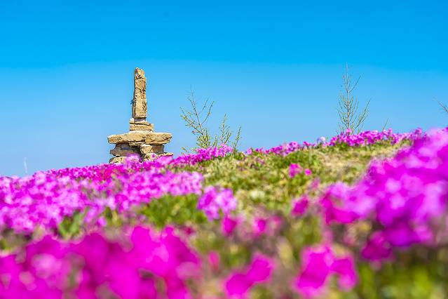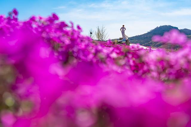 开车来了之后停在停车场,向上走两步就能看见芝樱花海的景观石。好家伙,可能是因为我们是工作日来的原因,这么大一片花海竟然都没什么人,真的是想怎么拍就怎么拍~赶着今天天气超级好,蓝天配着小红花,还有远山,整个人的心情都好了起来~