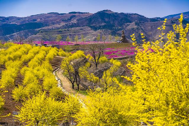 建议玩法:景区除了网红芝樱花海,还有很多金色的连翘,除此之外还有骑马,跑跑卡丁车,滑草等游玩项目,如果周末是带孩子来应该可以玩上个大半天。不过我们俩对这些都没什么兴趣,就这样在山里走走,把工作抛在脑后聊聊天,呼吸呼吸新鲜空气就挺好,毕竟早上六点多起来从济南开车过来还是挺辛苦哒~