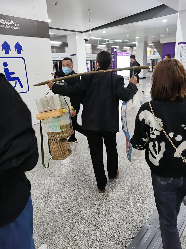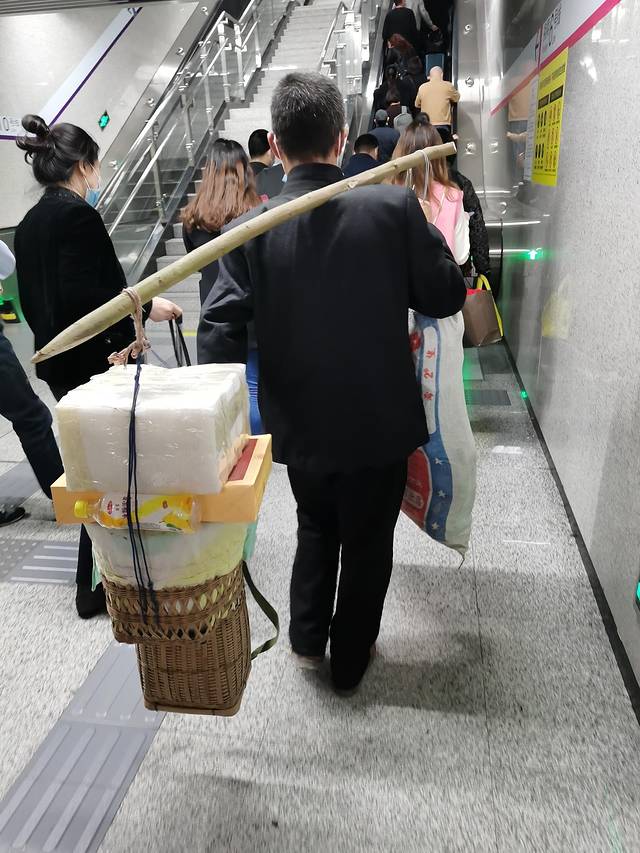 这位大哥,用棒棒挑了好多东西。这就是小时候看电视剧《山城棒棒军》里面的那个样子。