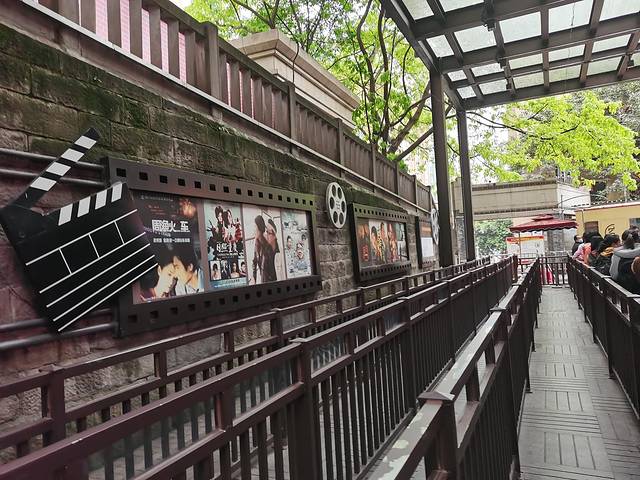 这里墙上挂满了在长江索道取景过的电影海报。排到门前需要乘电梯上楼,然后就是准备扫码乘坐。