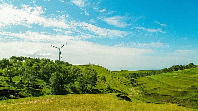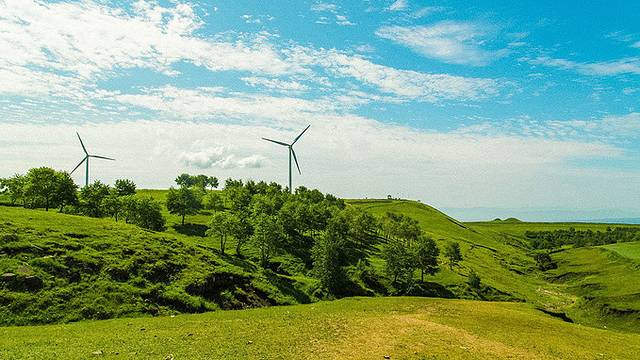 巨大的风力发电机组,矗立在高高的山岗上。衬着蓝天。白 云和 绿色的草原也是一种美丽的风景