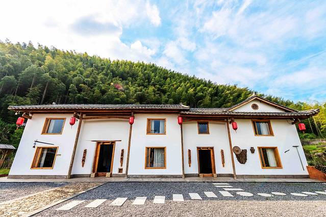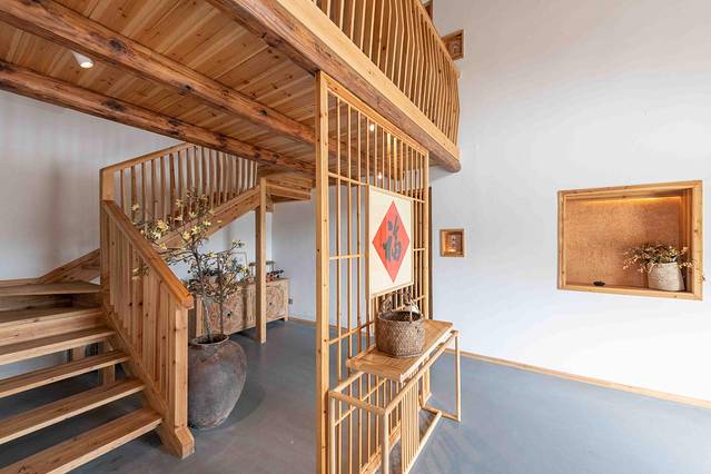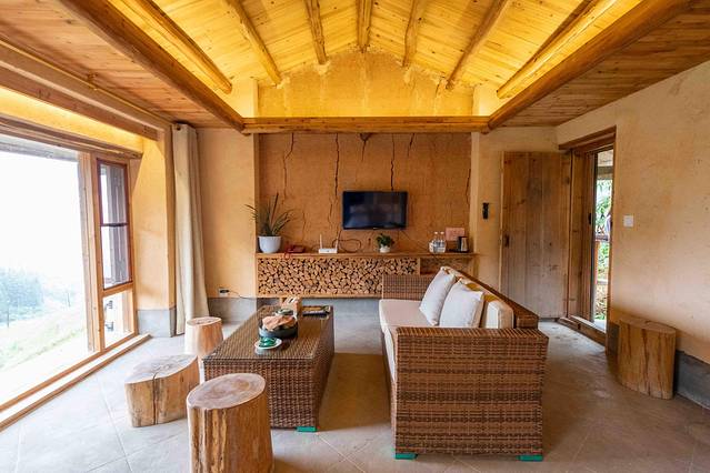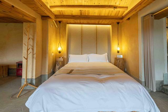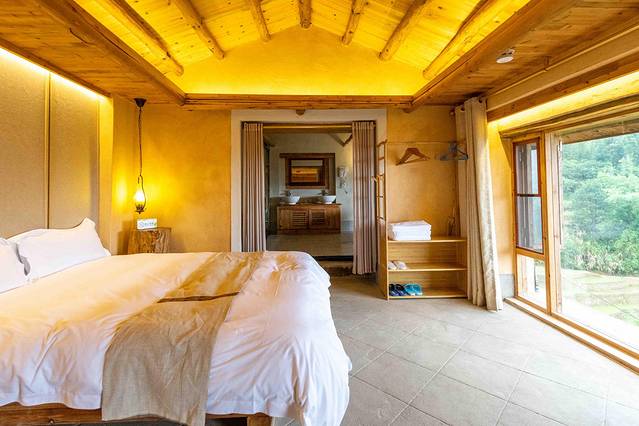木梓排整体以原木风为设计主题,营造出了轻松、淡泊而禅意的空间氛围,这里的套房留有大面积的落地窗,原木的家具和ins风的装饰,大落地窗外是稻田或竹林,将五星级的标配置于乡间小舍,一切都美得刚刚好。