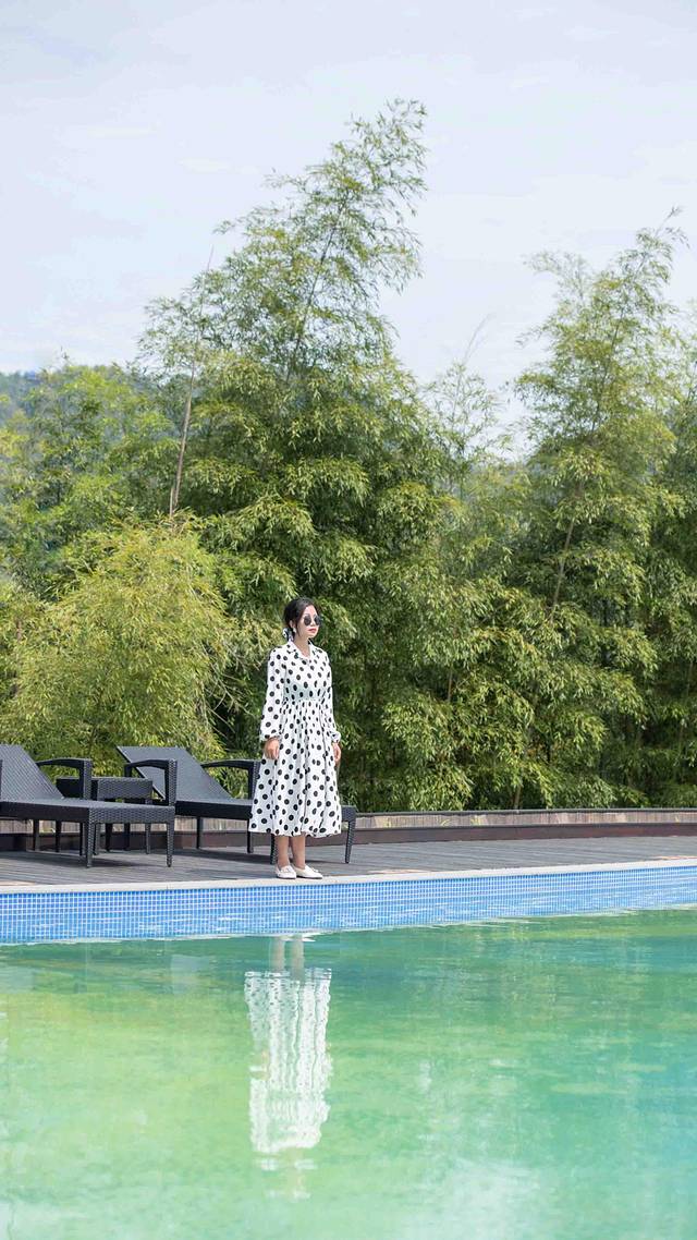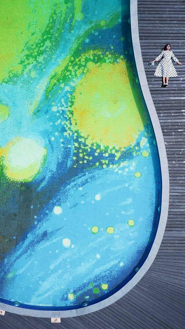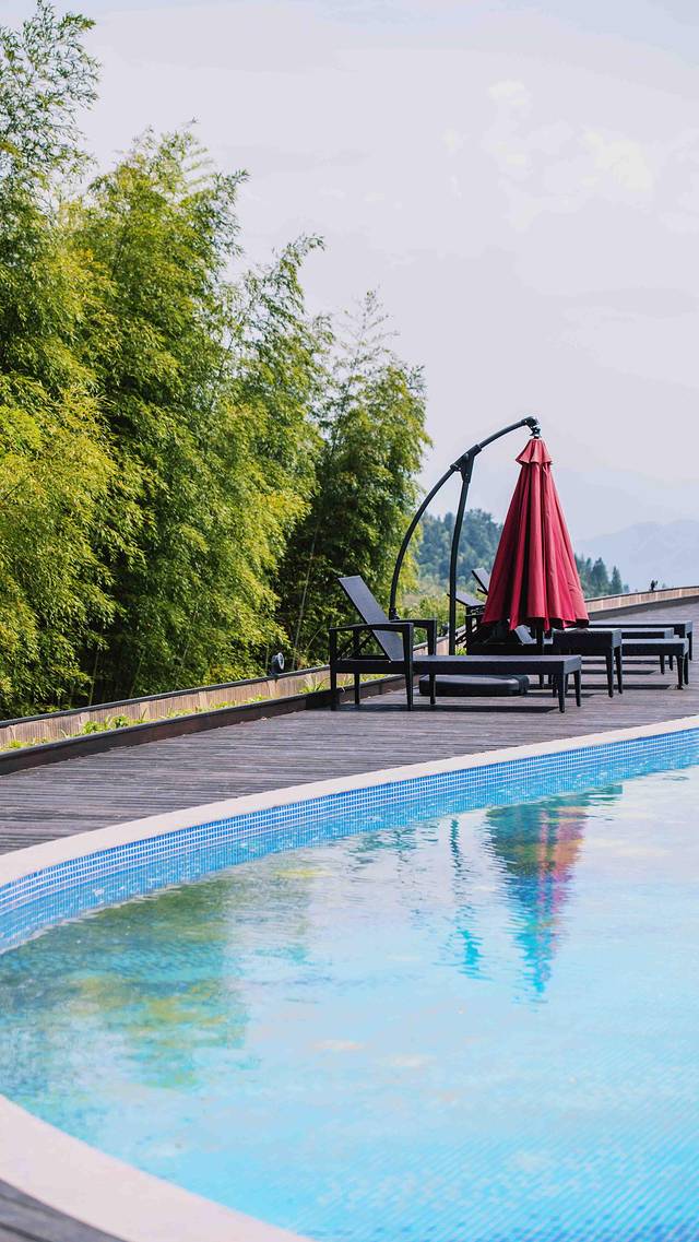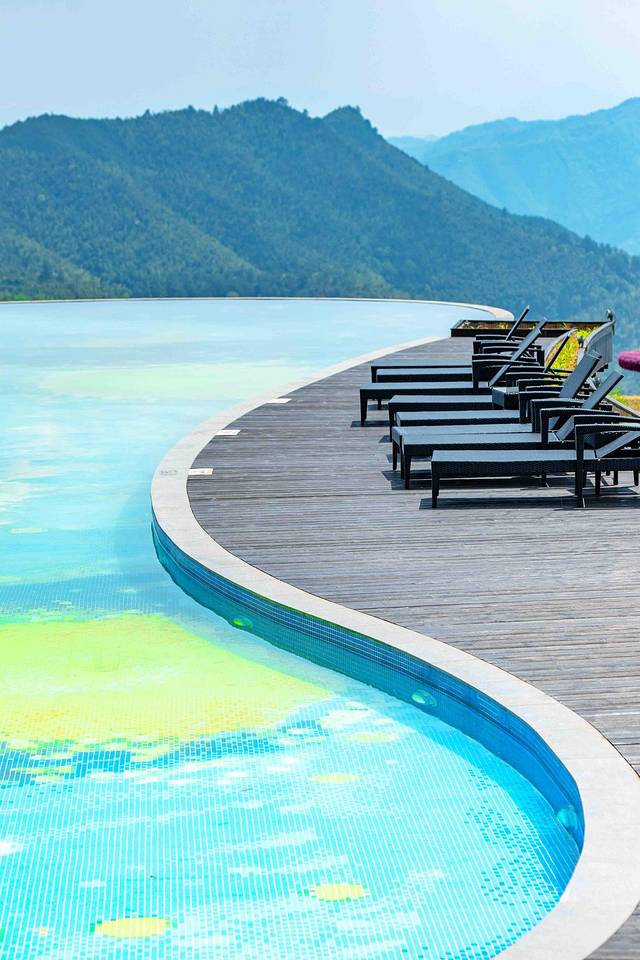 无边泳池的池底以五彩斑斓的图案为背景,远远看过去就像是一副艺术作品跃于眼前,泳池的水质真的是肉眼可见的清澈,在出太阳的时候,水面泛着丝丝星光,任谁看了都想马上跳下去清凉一下。最重要的是在这里拍照也太容易出片了,坐在泳池旁边的休息椅上,漂亮的无边泳池和梯田衔接自然!通过航拍,绝美的“梯田泳池大片”绝对霸屏朋友圈。