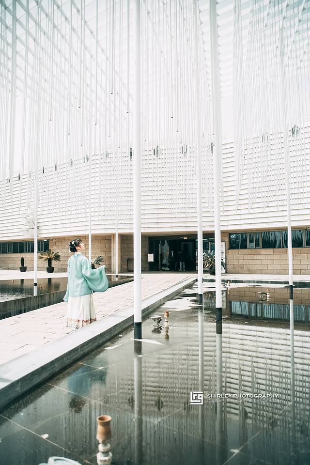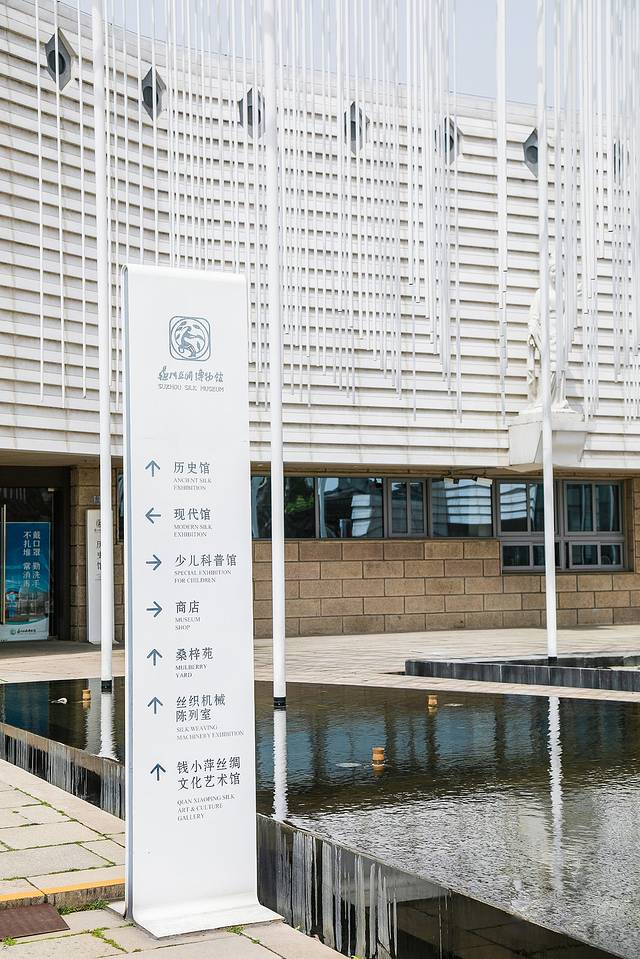 苏州丝绸博物馆,可能远没有杭州的丝绸博物馆那么出名,网上资料也不太多,实地到了之后反而惊喜连连。入口处便是极具网红打卡潜质的一片纯白色“丝雨”,这是一处有白色金属细管组成的艺术装置。白色是丝绸的本色,既能点题又极具当代设计风格。旁边的水池给予增色的倒影,让我们还未进入博物馆,就在外面拍得欲罢不能。