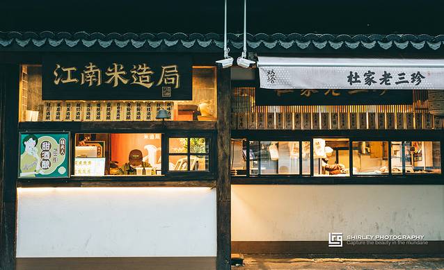 市集外,石匠弄一侧的沿街铺面,是仿造旧时江南一带的建筑风格,傍晚时灯光点亮,江南百景图的感觉来了!