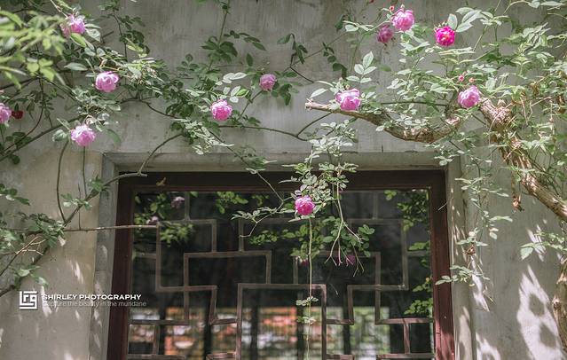 艺圃原名药圃,在园林里种植花草,当寄托着园林主人热爱自然的精神向往。春天时的艺圃,粉色的蔷薇灿烂了整面斑驳的墙壁,枝蔓款款垂落,投射着灵动闪烁的光影。每次看到蔷薇盛放,似乎预示着江南的夏天也不远了。