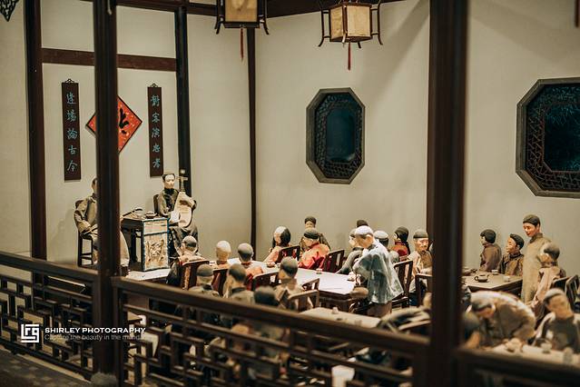 馆内还用微型雕塑表现了200多年前的清朝,苏州城内遍布大街小巷的书场、茶馆,日夜有评弹演员演出,无论高官达人、挑夫走卒,喜爱者众多。