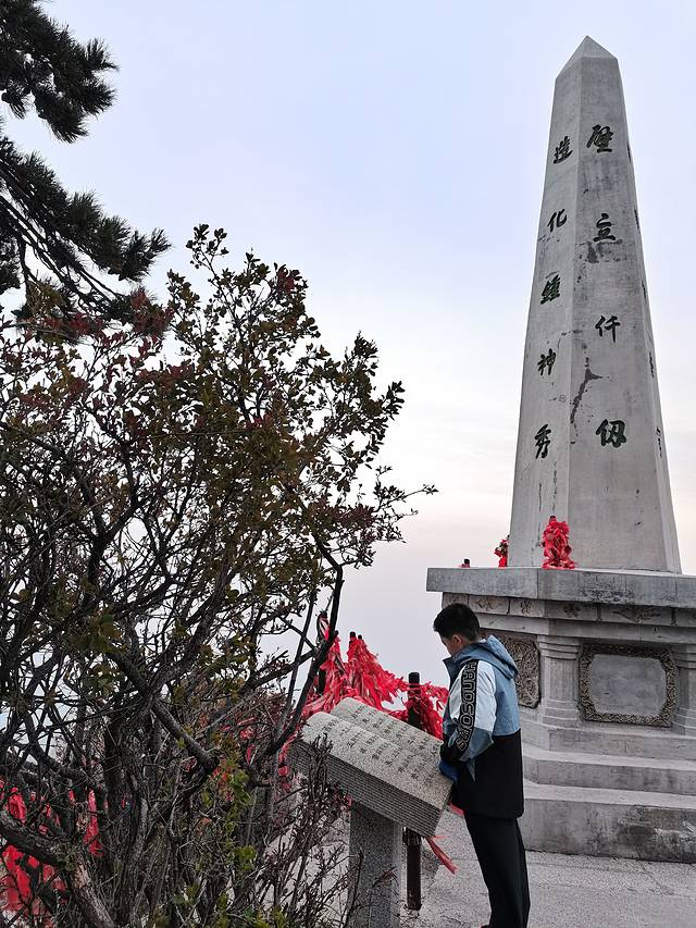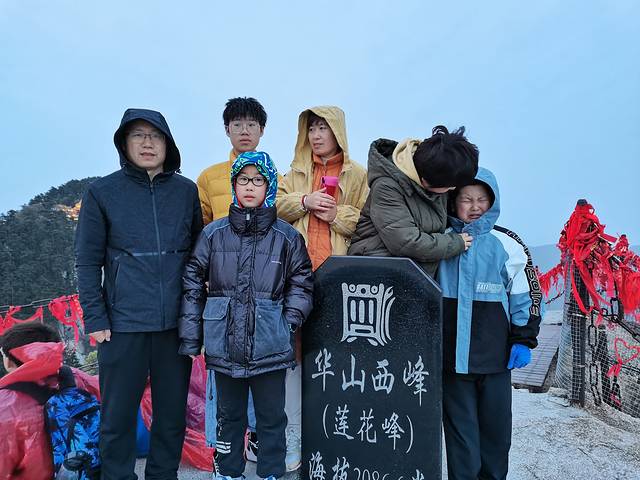凌晨五点,小伙伴们守候在西峰峰顶,风特别大,我们幸好带了厚衣服,把所带衣物全部穿在了身上😄。可惜,太阳公公无比羞涩,终是躲在厚厚的云层中,无法一视其真面目。幸好没有早起一个小时赶到东峰。此刻,远眺东峰,夜爬的人们还在排队上峰顶。其实想想夜爬真是不划来,一晚上不停歇的爬,黑漆漆的夜也不知道害怕,不过也错过了很多景致。