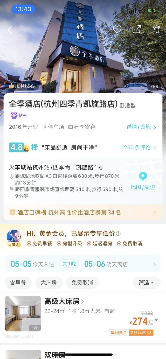 吃完我们绕着西湖南边走了一圈就回酒店了,考虑到第二天要从杭州站出发,所以定了杭州站附近的全季,走路到杭州站大概十五分钟,还是很方便的,4月30的的价格比图上贵100元左右