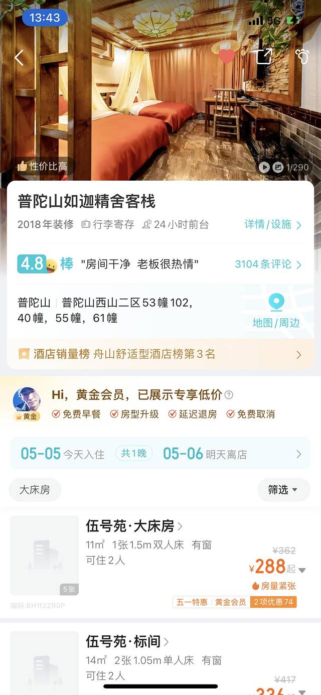五一期间岛上的民宿和酒店溢价都太严重了,价格贵了三倍左右,最后选了一个叫如伽精舍的民宿,1号当天的价格是738,如果是淡季200多就可以搞定。