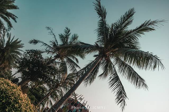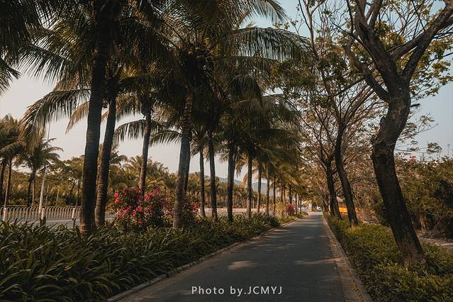 骑行在路上,两旁高大的椰子树遮挡出林荫小道,迎面的海风袭来,顿时感受到阵阵凉爽。