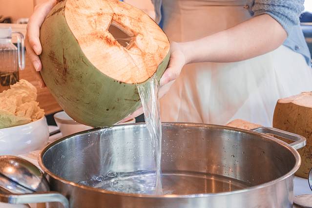 自己将3个椰子的椰子水倒入锅中,感觉还特别的有仪式感