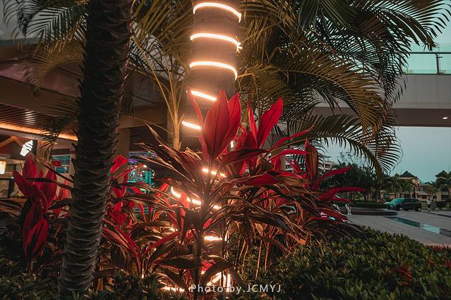 夜幕下 亮起了景观灯,植物在灯光的辉映下显得分外好看