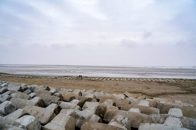 为了防止涨潮时的排浪,这里斜着放了一堆的石块,整齐又统一。景区又很有童心的在石头上绘制了各种候鸟的图案,既丰富了色彩,又更加的具有观赏性。
