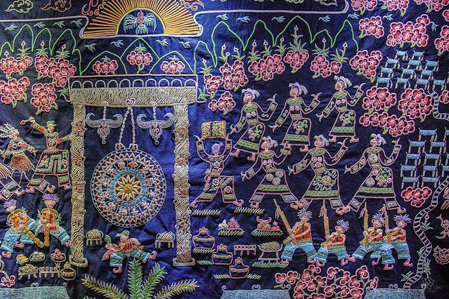 水族马尾绣,是以丝线缠裹马尾盘在描绘好的花纹轮廓上,再根据轮廓线绣出各种图案,工艺复杂,具有很高的艺术价值,是中国国家级非物质文化遗产。