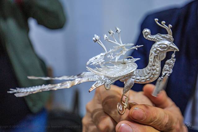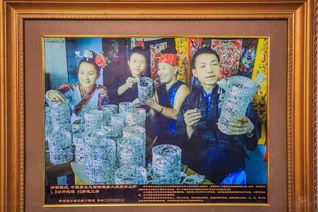 室内的展览室,不仅有着众多知名活动现场的照片,还有这一些吴水根的拿手作品,摆着满满一面墙的各种证书着实也让人看的眼花缭乱,对于吴水根的敬仰更是如滔滔江水连绵不绝,据说原本制银的这项技术是传男不传女的,而为了带领整个村寨的村民致富,吴水根首先打破了这个传统,带了更多的徒弟或村民学习制银的工艺。
