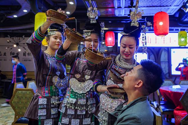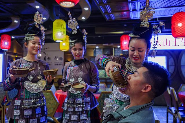 可能不少小伙伴对于高山流水同样的好奇,其实这是一种当地少数民族非常推崇的接待贵宾的方式。至少由三名以上的女孩手拿酒壶,从高到低将酒倒至你面前的碗里,这里的面前可以理解为嘴前,而倒酒的速度和你喝酒的速度基本成正比,就是说你喝的越快倒得越快,喝的越慢,倒得也会相对慢一些,总之不喝是不可能的,作为大家的头号公敌,我当然难辞其咎,第一个享受了这种VIP级别的服务,不得不说,酒是好酒,倒酒的手法也非常娴熟,就是这酒量的确不小,妄图一次性把就喝完的我着实是想多了,在此,我诚挚的建议大家面对这种阵仗还是不要逞强了,适可而止比较好。