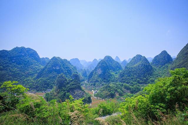 万峰林景色丰富,登高远眺,青灰色的秀峰似林,黄绿相间的田野成片,村庄坐落其中,小河弯弯曲曲,宛如一幅浓墨重彩的山水画卷。