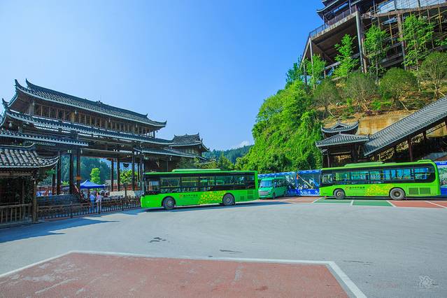 进入景区大门后仍需搭乘景区观光巴士进入真正的苗寨,当然其实这里的车程很短,5分钟的车程后,村寨内的道路就只能依靠步行了。