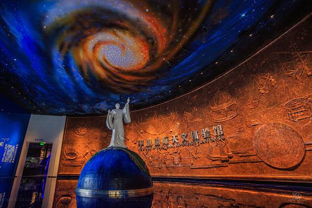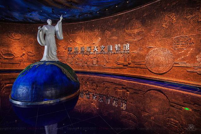 入口处的是一座屈原问天雕塑。屈原曾作了一篇长诗《天问》 ,这首诗是屈原对于天地、自然和人世等一切事物现象的发问,描述许多古代所观测的天文现象。而背后的浮雕墙刻录了古今中外观天仪器的演变,从古人肉眼观天、第一台望远镜的发明到哈勃望远镜的成功发射,让前来的参观者无一不佩服前人对中国天文作出的成就。