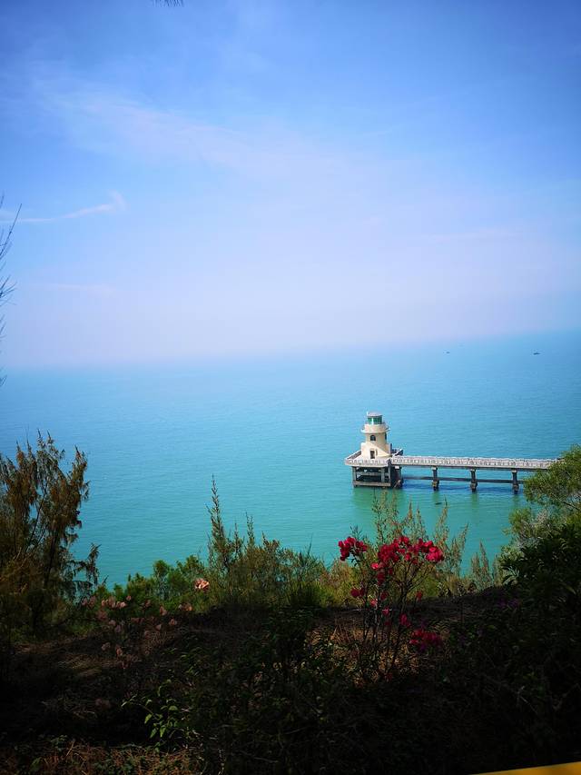 路过钱澳湾灯塔。白色的塔身,浅绿色的塔顶,有一条长长的栈桥与陆地相连。