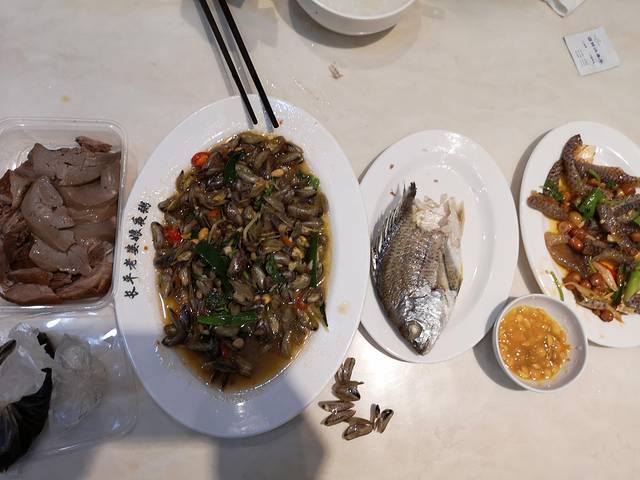 心心念念地打的到口碑不错的盛记鹅肉,却只是一家小门面的外卖店,打包了鹅肉与鹅肝,还配有卤蘸水和醋蒜汁,鹅肝绝对让人惊艳了。马路斜对面是粥店,潮汕的粥店也不是我本以为的早餐店,而是当地的夜宵地,现在是24小时营业着。各种生腌、卤水、粿品、鱼饭、小炒似乎都为了配一碗热乎乎的白粥。点了炒薄壳、鱼饭都挺不错。鱼饭可能是从前渔民出海“以鱼当饭”而得名,主要是留住了鲜活,配的普宁豆酱真是咸。