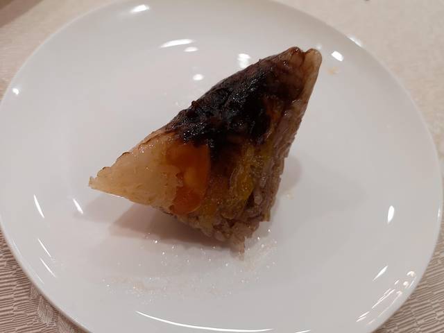 在潮州宾馆先用了早餐。潮汕粽子因形似球体而被称为粽球,以双烹粽出名,一个粽球里头有咸蛋黄、肉、甜豆沙、蜜饯、栗子等,又甜又咸,感觉比前天老宫妈那儿吃的明显好。