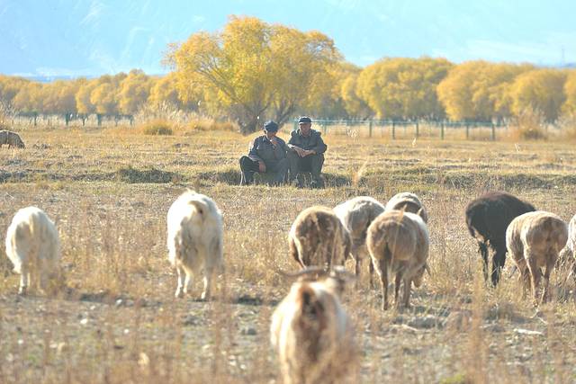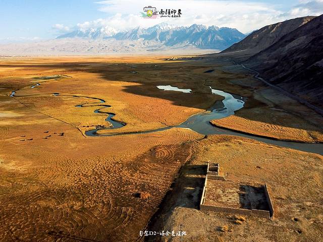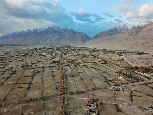 一早从塔什库尔干县城出发,在县城边上有个房车露营地,还在建设中,那后面就是雪山,一排胡杨树已经变黄,早上的光线特别柔和,于是放了无人机上去航拍,不是对面好像有动静还真舍不得走。然后往前开开拐进了一个叫塔合曼乡的小村庄,是这里的一天金黄色林荫大道吸引了我们,旁边还遇上了放牧的牧民,我们一看就是外地来的,有三个拿着盾牌的民兵来回巡逻,一直跟我们说要“登记”,开始我们至少想随便拍几张会走了,后来还是打算开到这条路的尽头看看村子里还有什么好玩的地方,我们停好车,看见远处放牧的大叔和一群,于是我又放起了无人机,羊羊呆住了,后来有个塔吉克族的警察来了,还是坚持要我们去登记,这回逃不掉了,于是去看看究竟,跟着警察的摩托到了派出所,结果管事的汉族警官说我们是离开的就不用了,免去了登记的手续。不过之前在路边有人好心停下车来说明天有塔吉克族的婚礼邀请我们去,还有一年一度的吊羊节,肯定很热闹,可惜我们是明天一早的飞机,今晚不得不赶回喀什,否则后面的行程也将打乱,于是留下来很大的遗憾继续回程。后来听说塔什库尔干县城附近的几个边境村庄风土人情都非常值得去探访,只能把这样的计划列入下次。回程一路都没有检查或发区间测速单的地方了,不过看见车速牌还是按照规定的速度行驶比较好,回程到了奥依塔格镇也没遇到发区间测速单的警察。到酒店办了入住后去还车,然后在附近的一条街上找了一家餐厅吃饭,因为语言不通也就不特别推荐了,就吃了碟大盘鸡和一盘青菜,外加一份面条。后来走回酒店,路上看见了他们的烤肉店、烤包子店和路边撸串摊、烤玉米摊,那就是当地人的生活,一切再平常不过。