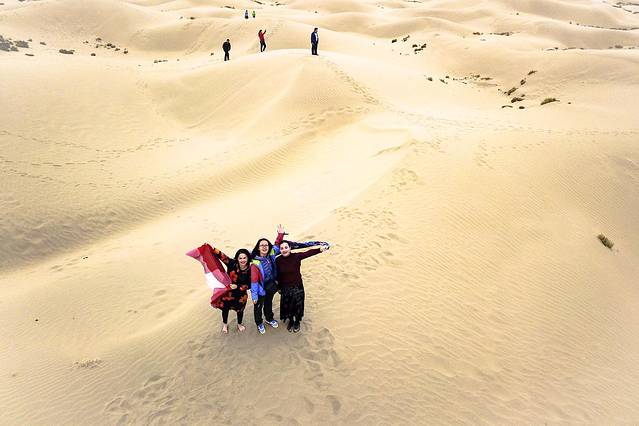 8:00退房在宾馆旁边解决了早餐,还是选了我喜欢的胡辣汤加烙饼,8:30左右到的景区门口,因为前一晚一个会中文的保安大叔告诉我们九点钟前游客不多的时候可以跟队长申请自己开车进园里,很幸运那天早上我们还是遇上了他,于是还真如愿地拿上景区临时车牌进去了。有点美中不足的是当天天气不太好,没拍出太震撼的大片,不过尽是金色树冠的林子也是浓浓的秋色,在这里能拍出不错的人像大片。拍完了我们还得往塔中方向开一段沙漠公路好好感受一下,离开塔河前还是遇上检查站了,问我们去哪里,我们回答说只是到前面看看,所以也没领到限速单。有点失望的是开了100多公里一直没找到两边没有固沙林的沙漠公路,但也专门在一处运行停车的停车处走进了塔克拉玛干沙漠的边缘。凹凹造型,放放无人机就离开了,因为我们当天还得赶回库尔勒去。重要的是我们上高速以后天才黑,这个时间还是拿捏得恰到好处。晚上回到大城市库尔勒,看见了满街的霓虹和一个个购物广场,感觉又回到了家一样。我们的酒店就位于购物广场里,所以停车和入住都非常方便,晚饭也在购物广场里找了一家老火锅来大开吃戒。