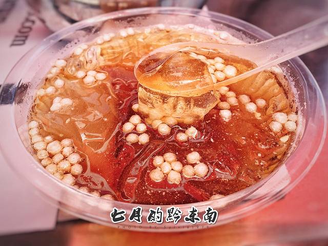 手工冰粉,据说是一种植物做的,有点像我们的凉粉,不过口感更清爽细滑,主材以外还加入适量冰水、炒米、花生粉、红糖粉、山楂粒,炎热夏日来一碗才5元钱,比何可乐那些添加剂调制出来的饮料好多了。