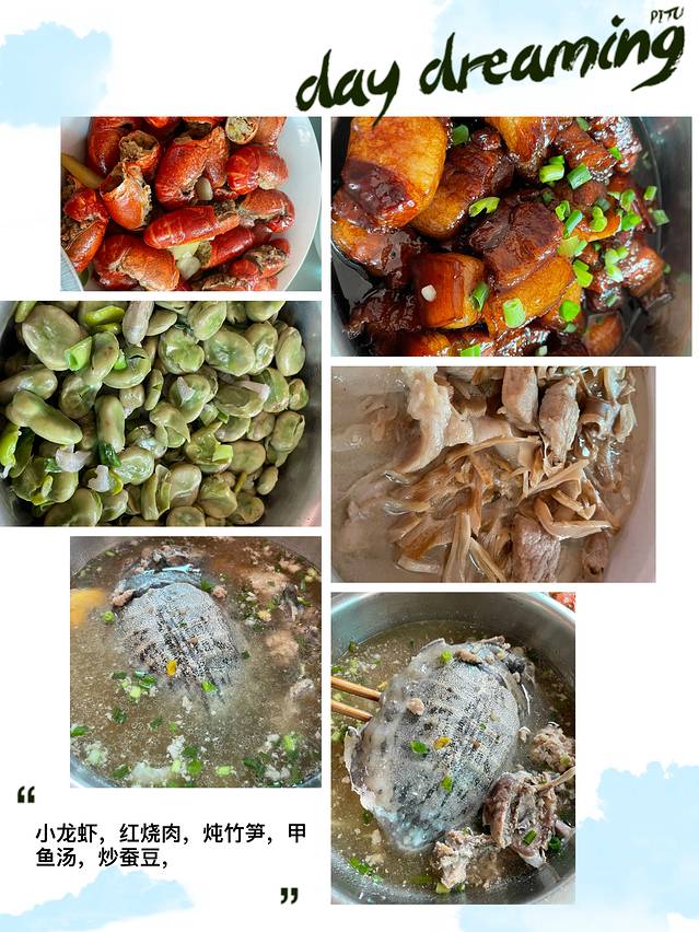 都是当地的特色菜自己在家做,特别好吃,小龙虾也正是季节,甲鱼汤也很鲜美