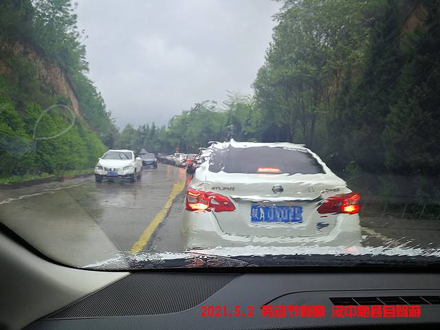 由于道路维修单向通行,在此路段遭遇拥堵近一小时。不过,拥堵并没有太影响我们的心情,停停走走正好可以慢慢欣赏雨雾胜景,还可以不时玩玩自拍。