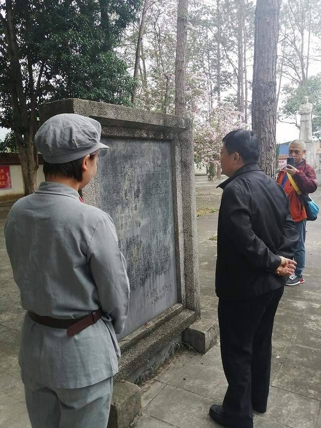 身穿红服的解说员向我们介绍坡鉴烈士陵园的情况