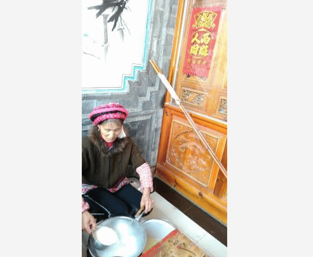 正在制做名吃“乳扇”,主要原料是酸水和牛奶。大约二十多分钟后液态牛奶变成固态,可以绕在竹杆上晾晒。取下油炸着吃。