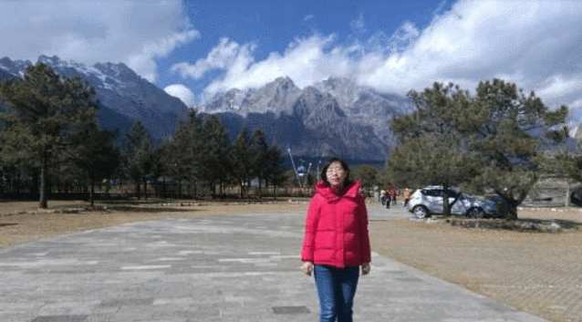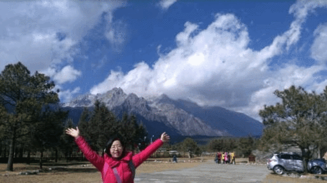 后面就是玉龙雪山,天蓝云白。远望雪山,似乎没有想象中峻朗。