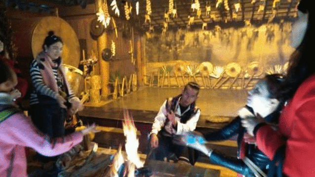 民族村中聚拢了25个少数民族的居住样本:彝、白、哈尼、傣、傈僳、纳西、瑶、景颇、布依、水、独龙等。走过傣族的吊脚楼,循着烤肉的香味,进入纳西族的小楼,众人围坐火盆边,看火苗向上蹿,低矮的屋顶上挂着一串串烤肉。