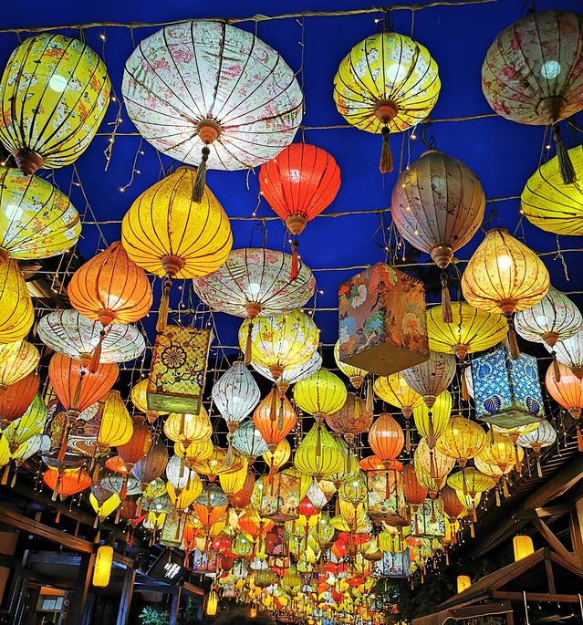 夜幕来临,各式各样的宫灯很美。第一次穿汉服,还好,没有想象中胖。在妙音阁灯光秀和水幕电影时段,突然人就多了起来,比肩接踵。其他演出都是,嗯,漫不经心,没什么看的。