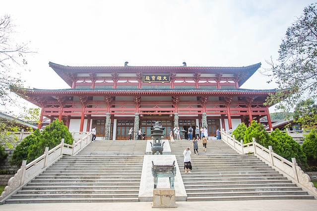 天王殿、大雄宝殿、观音殿、地藏殿、药师殿、三圣殿、伽蓝殿等殿堂一字排开,寺院里的参天古树又显得寺院格调不凡,敬畏之心亦油然而生。