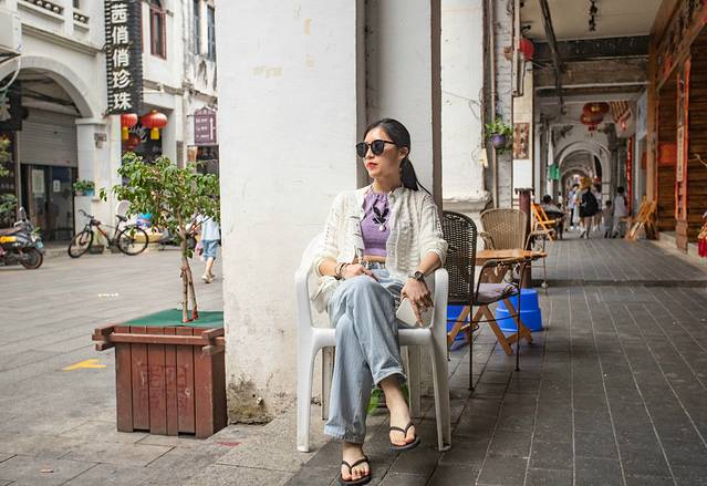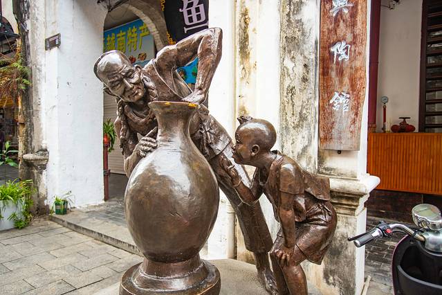 临街墙面部不同式样的装饰和浮雕形成了南北两组空中雕塑长廊。这些建筑临街的骑楼部分,既是道路向两侧的扩展又是铺面向外部的延伸,所以游人走在老街上,特别凉爽。