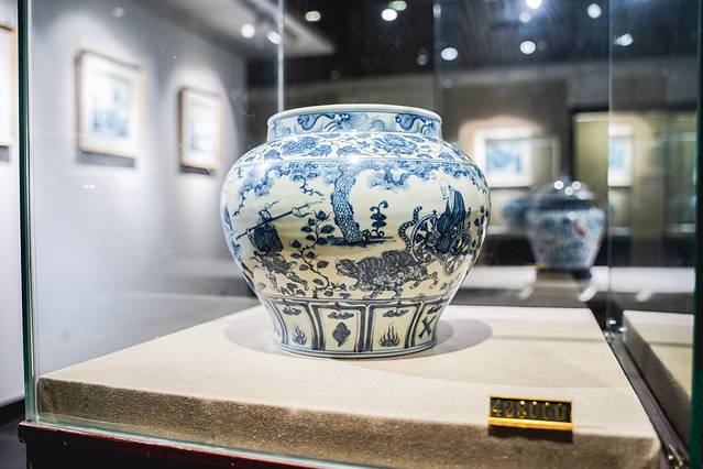 这一件便是景德镇中国陶瓷博物馆的镇馆之宝、国家一级文物——元·青花缠枝牡丹纹梅瓶。小口,丰肩,收腹,器身至上而下绘五层纹饰。肩上覆莲瓣纹,内绘八宝纹,腹部绘缠枝牡丹,下腹绘仰莲瓣纹。整件器物层次多,纹饰满,釉色青白,青花发色浓郁。