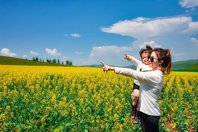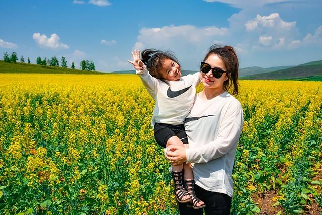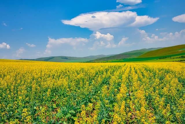 油菜花的黄和 呼伦贝尔 的蓝天白云绿草地特别的搭,一层一层、一块一块,黄绿相接,真的像是打翻的调色盘,无意的洒落在草原的各个角落。