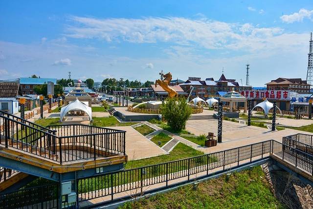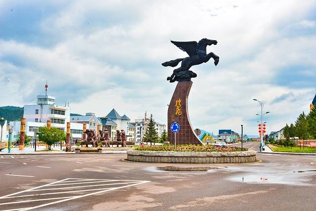 镇上有一座广场,金色飞马的雕塑格外显眼,观景台下面就是一望无际的草场,界河对面的 俄罗斯 小镇肉眼可见。