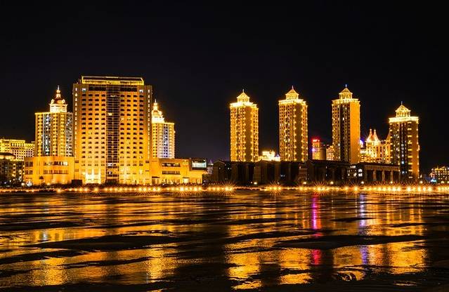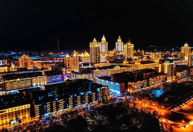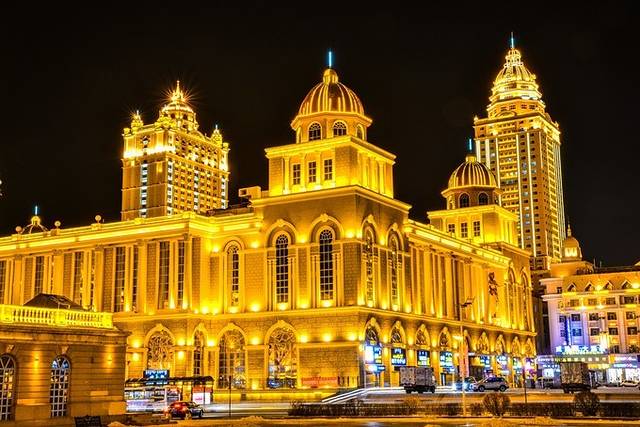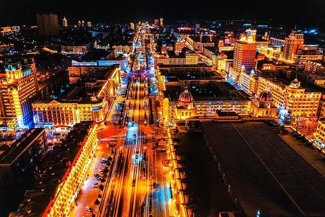 灯光把整个满洲里 的色彩照映的十分统一,黄金般光芒勾勒出建筑的线条和轮廓,加上建筑风格的多样性,让这里的异域风情一览无余,如同一座“黄金之城”。