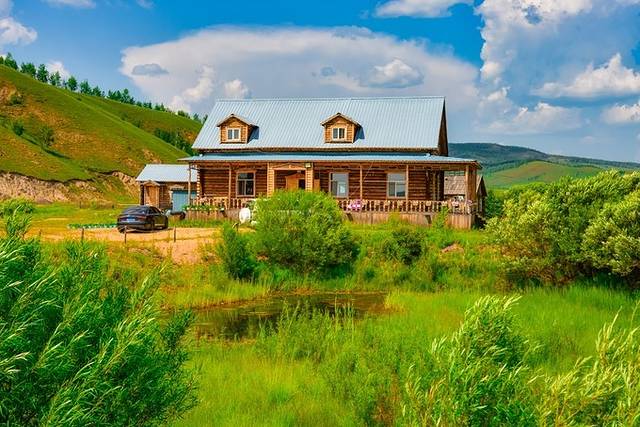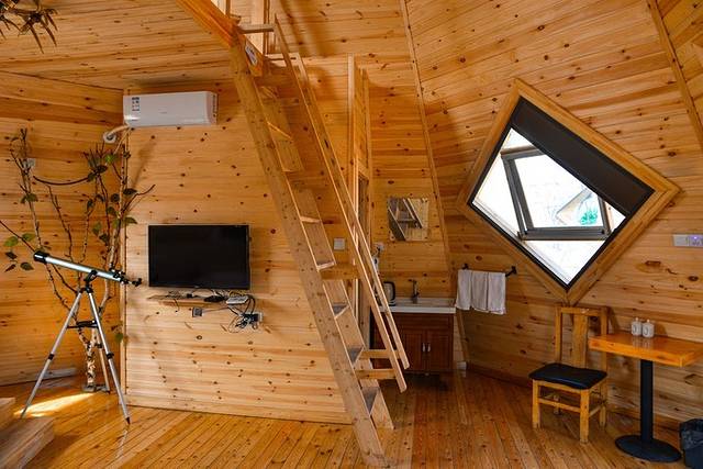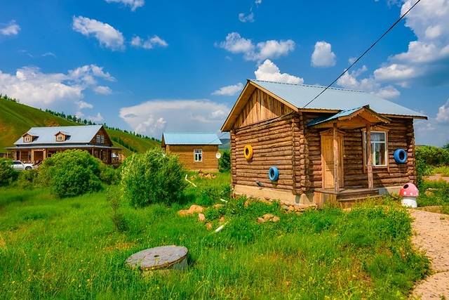 湛蓝的天空白云朵朵,木头搭建的小屋子可爱多,像是漫话里的模样。