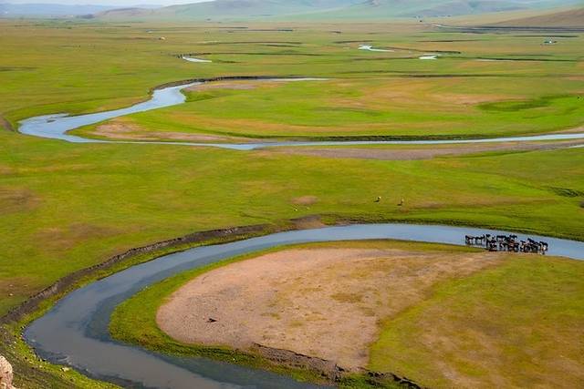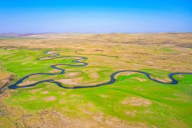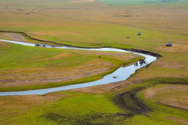 莫日格勒河蜿蜒曲折,像一条彩色的带子遗落在丰美的草原大地上,成群的牛马羊在河边嬉戏饮水,旁边就是稚嫩的青草,边吃边喝还能洗澡,也太舒服了吧。