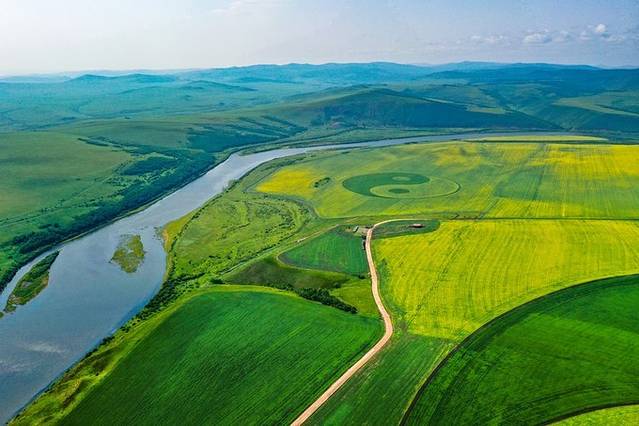在乌兰山上的观景台, 额尔古纳 河形成的天然太极图一览无余,阳光透过云层挥洒下来,蜿蜒的 额尔古纳 河闪烁着彩色的光芒,像一条巨龙俯卧在苍茫的草地上,格外的壮观。