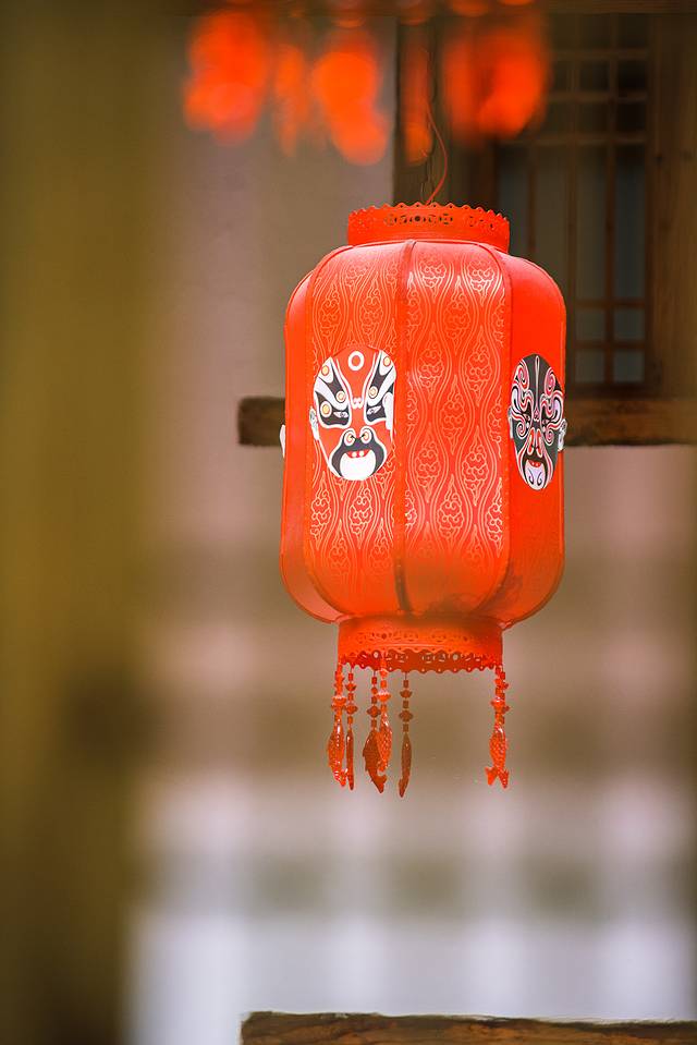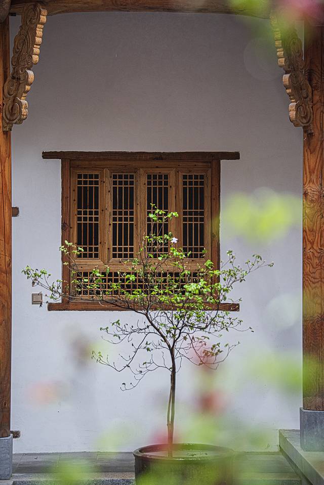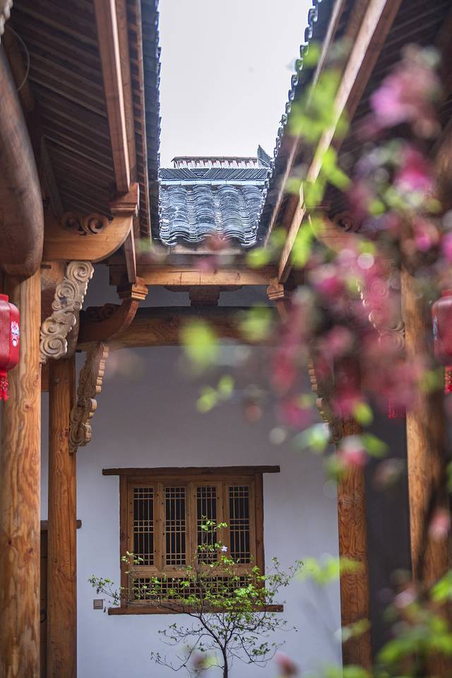 推开民宿厚重的复古木门,庭院宽敞洁净,小院的天井里点缀着各种花花草草,屋前的廊下挂着别致的红灯笼,每个房间的门口挂着各式各样的京剧头饰,古色古香又别具一格。