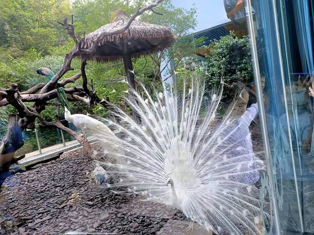 酒店大堂能看到孔雀,灰常爱开平的白孔雀,就在玻璃旁边,仿佛晓得人们喜欢看她开平的样子。酒店有个小门能出去到孔雀区域。